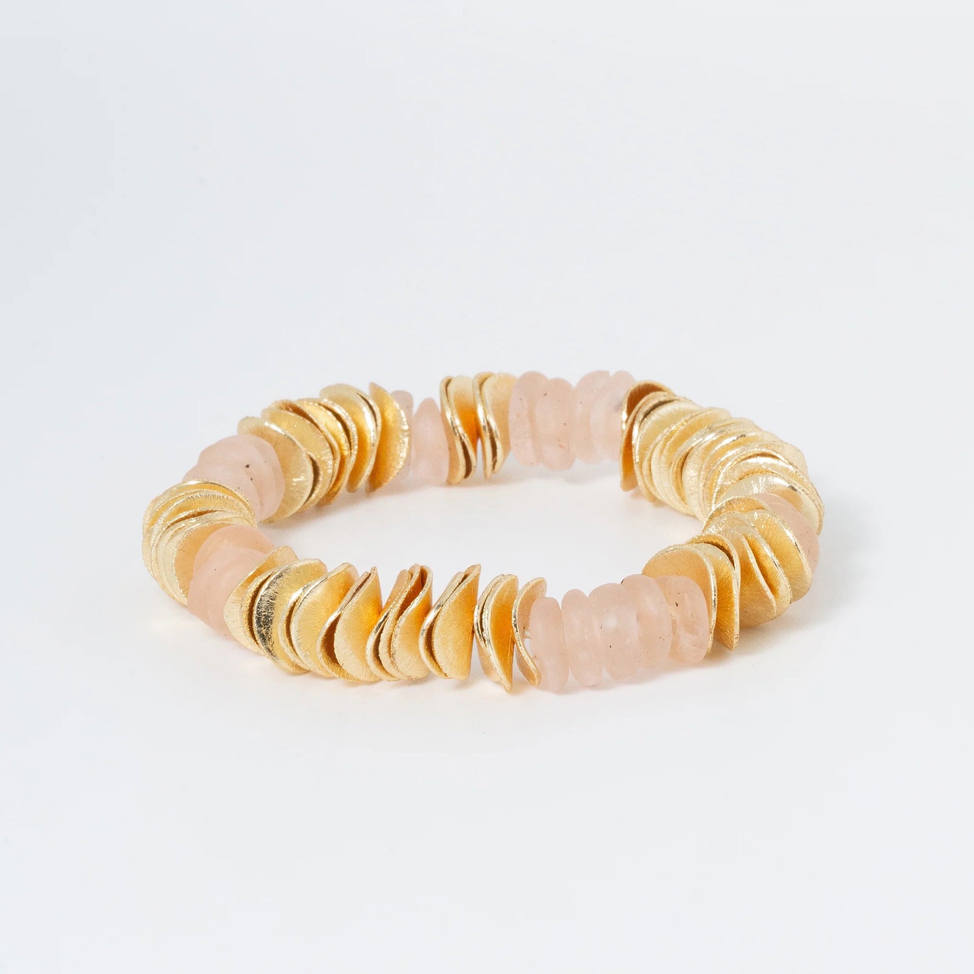Elevate your style with our Capri Sunset Bracelet. Mixed gold accents and the beautiful colors of a Capri sunset create an elegant look. Stack multiple bracelets in an array of colors or pair with a Seascape bracelet. This piece features 14mm wavy gold discs and recycled glass beads for a sustainable touch.