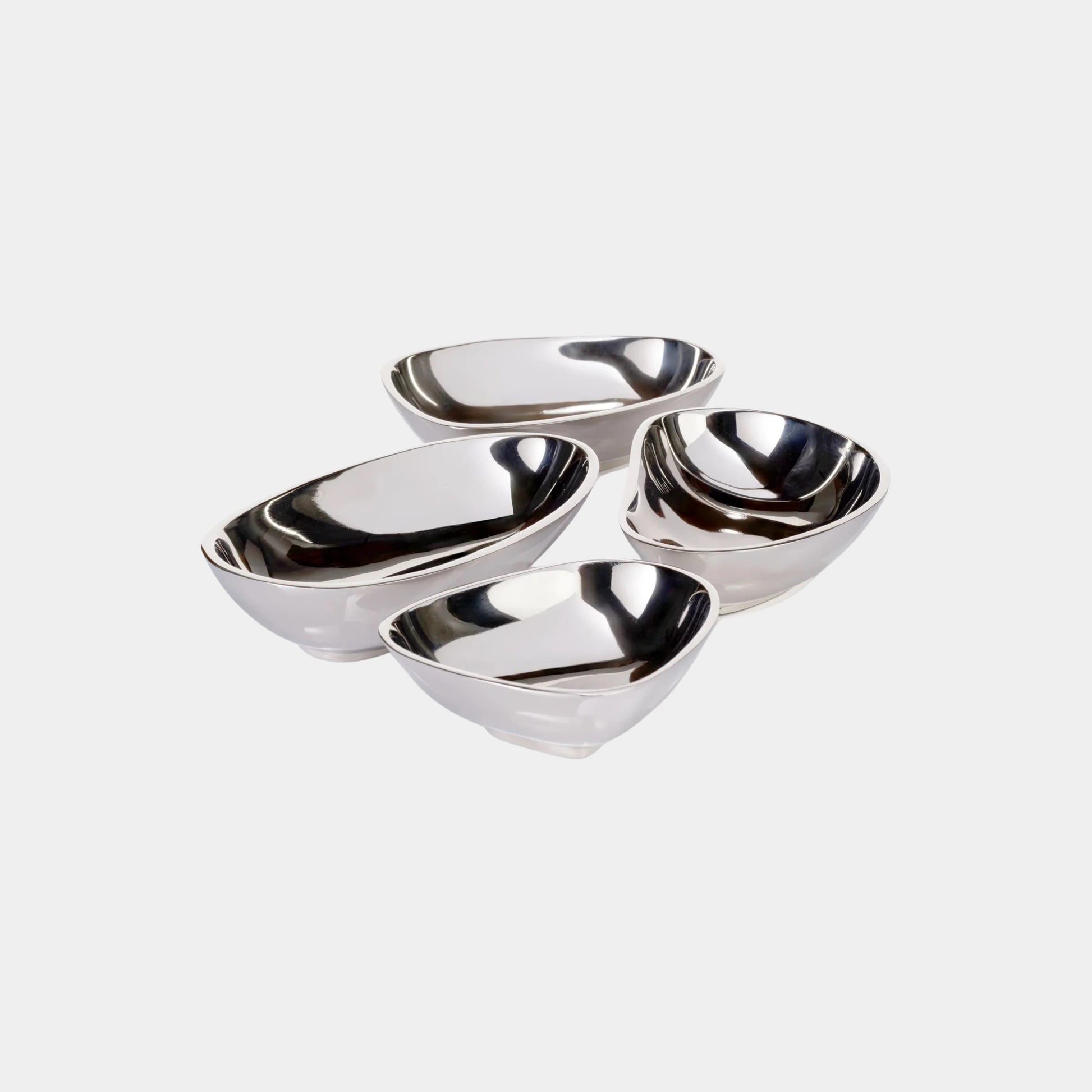 Introduce elegance to your dining experience with our Charm Condiment Bowls. These nickel-finished, lightweight aluminum bowls feature an organic, free-form design that adds an artistic touch to serving sauces, nuts, or dips. Elevate your table setting and indulge in a sophisticated presentation. A must-have for any refined occasion.